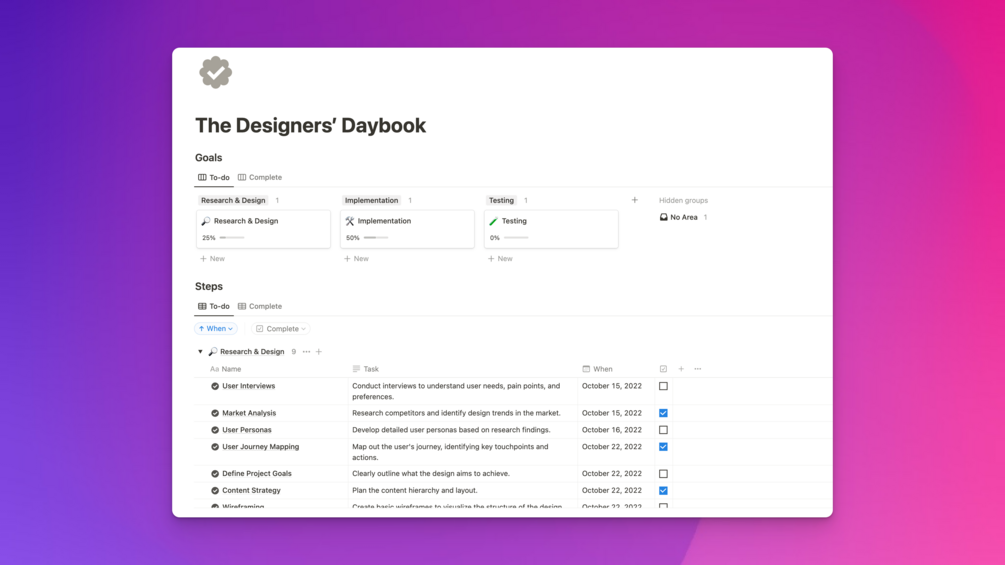 The Designer's Daybook is a meticulously crafted template designed to guide and support designers through every phase of the design process. It's a comprehensive tool that integrates tracking capabilities, ensuring you remain on top of your project's progress at every step.